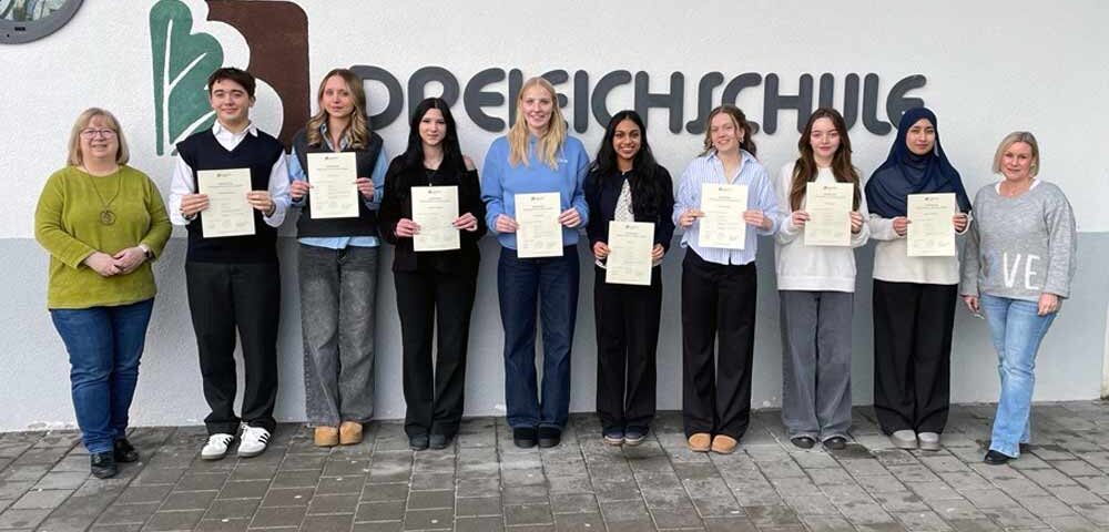 Emil Kartmann, Julia Mais, Roya Youssufzay, Hannah Remmert, Eshal Yasmin, Fiona Schmidt, Sarah Lungu und Nadja Masoud nahmen die vier Wahlangebote wahr und haben nun zusätzlich zu ihrem Q3 Zeugnis das English Certificate der Dreieichschule erhalten.
