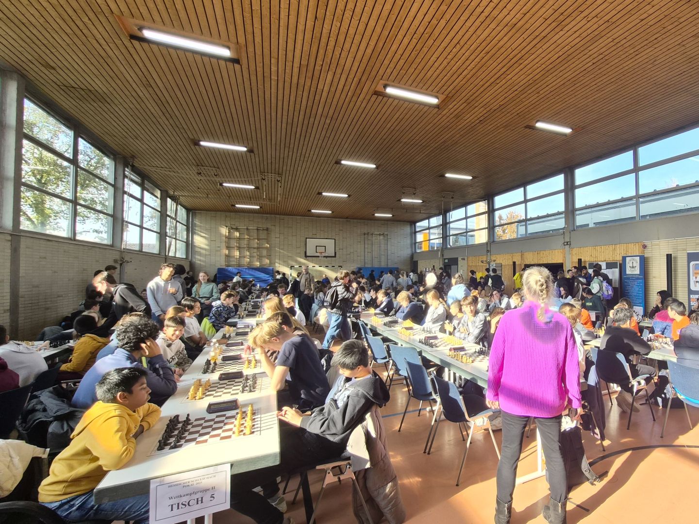 Am 6. November 2025 fand in der Kurt-Schuchmacher-Schule in Karben wieder einmal der Hessische Schulschachpokal statt. Es ist das größte Schachturnier für Schulschachmannschaften in Hessen, bei dem über 500 Schüler in verschiedenen Altersklassen gegeneinander antreten. Auch in diesem Jahr hatte der langjährige Organisator Simon Claus mit den Helfern seiner Schule in Karben ein tolles Event auf die Beine gestellt. Sowohl die Turnhalle als auch die große Aula wurden komplett dem Schach gewidmet. Nicht zuletzt das üppige Verpflegungsangebot mit frischen Waffeln, Pommes und Würstchen war wieder bemerkenswert.