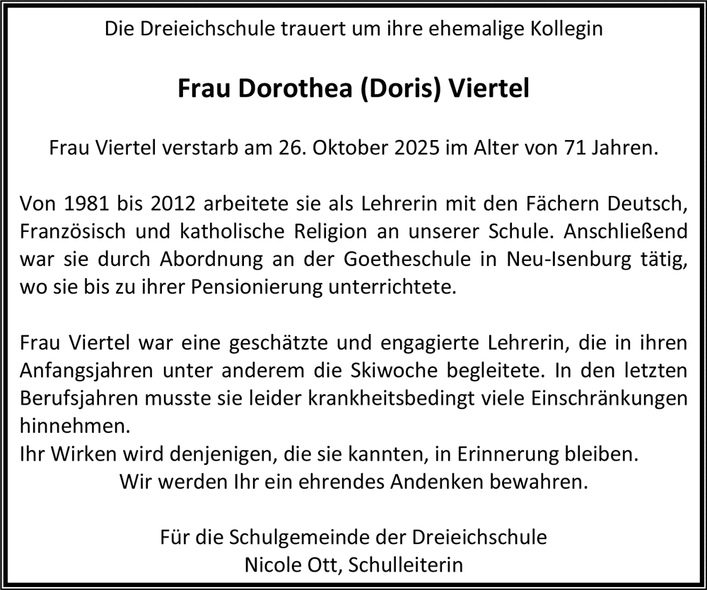 Dreieichschule trauert um ihre ehemalige Kollegin Doris Viertel